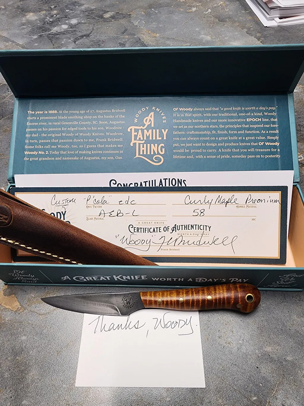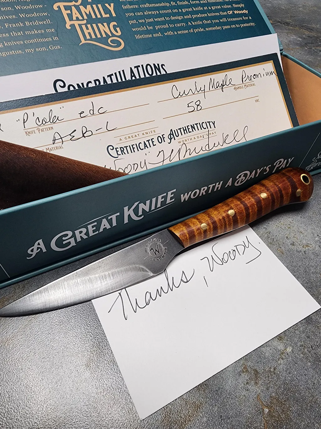 The build of this knife in nothing short of artwork. I purchased this as a gift for a hunting mentor to say thanks for all he has done for me. The wood is beautiful, the steel took a razors edge with a stone, a strop, and some stropping compound. The sheath fit like a glove. The packaging was top-tier, and talking with Woody on the phone was the icing on the cake. I love it so much, I ordered another one for myself. Everyone should own a knife of high quality. It can be passed on many times before there is no steel left to sharpen. Take pride in a few finer things in life. This is one of those things.