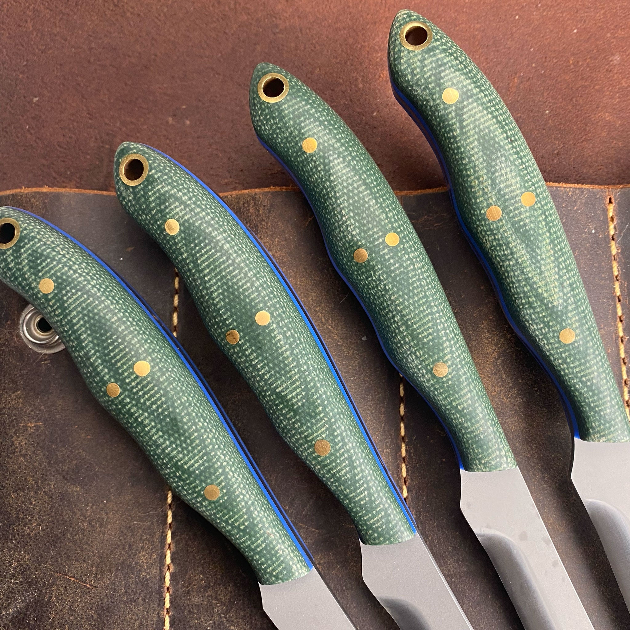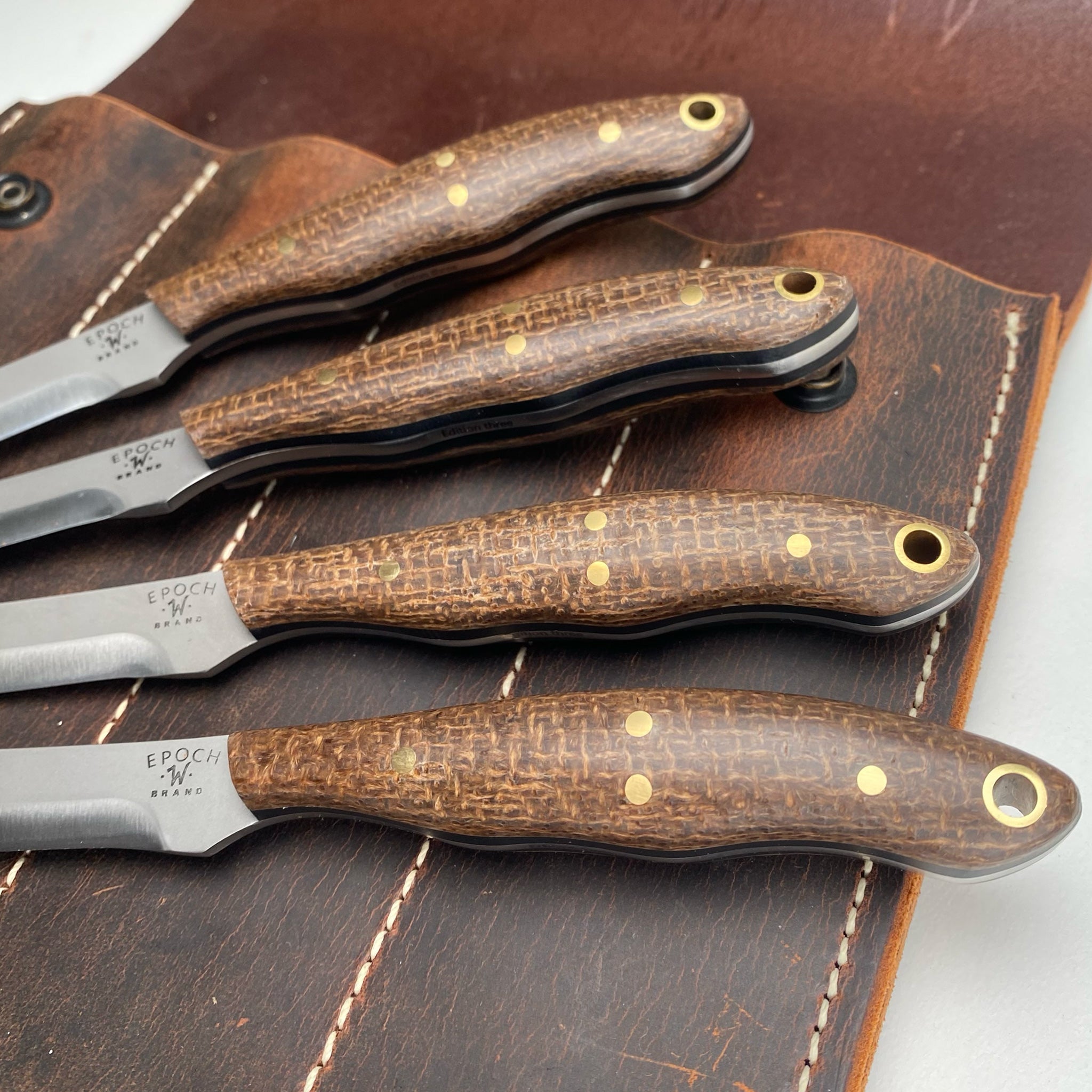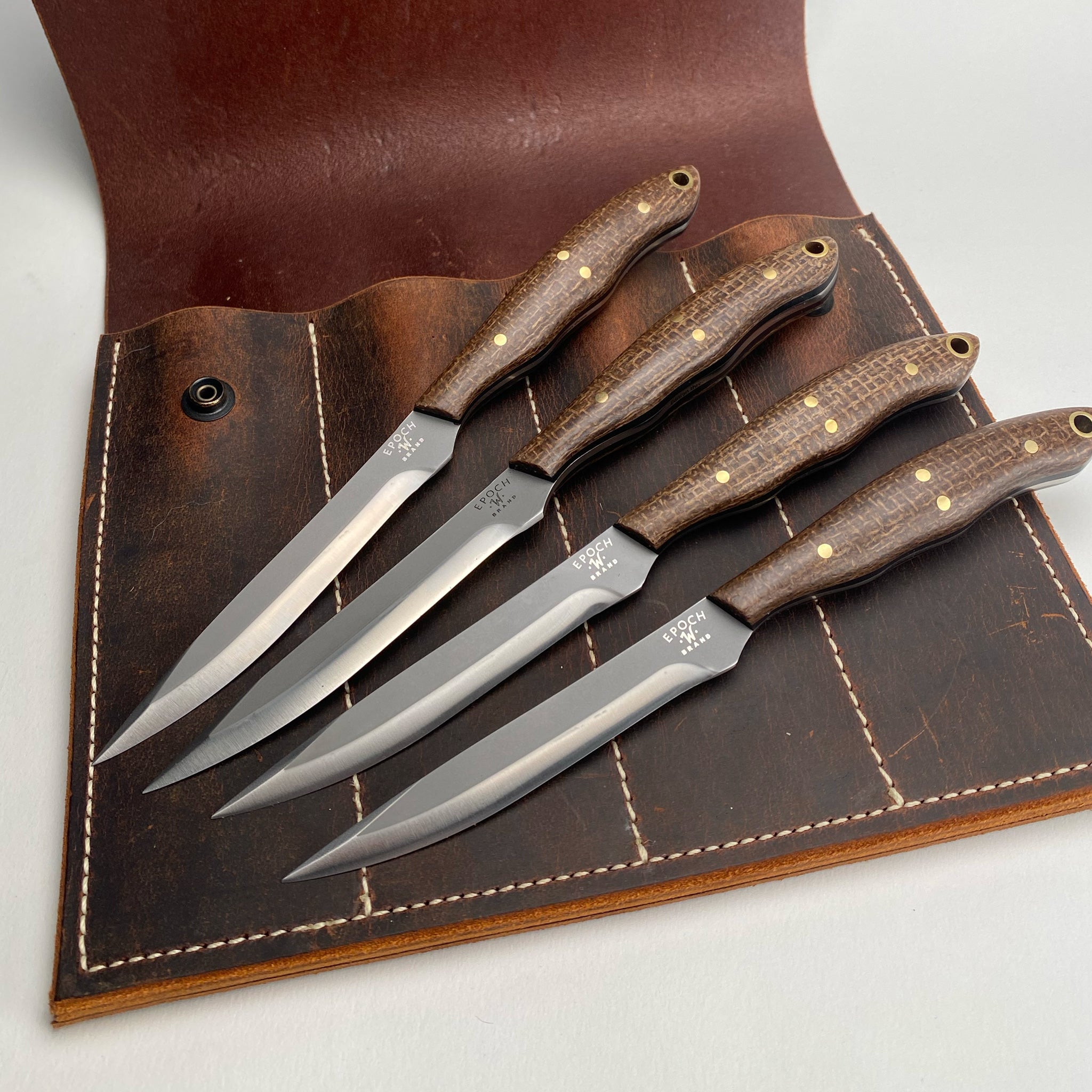 Includes EPOCH Dee Dandy Chef's Knife, Dee Dandy Chopper, King Jeremy Oyster Shucker and 4 piece Nomad Steak Set. (7 pieces) Choose either Umber Burlap (Brown) or Verde Canvas (Green) for the set of seven pieces. Sorry no mix and match on these sets - photos show mixed sets here for the purpose of showing the two colors available.