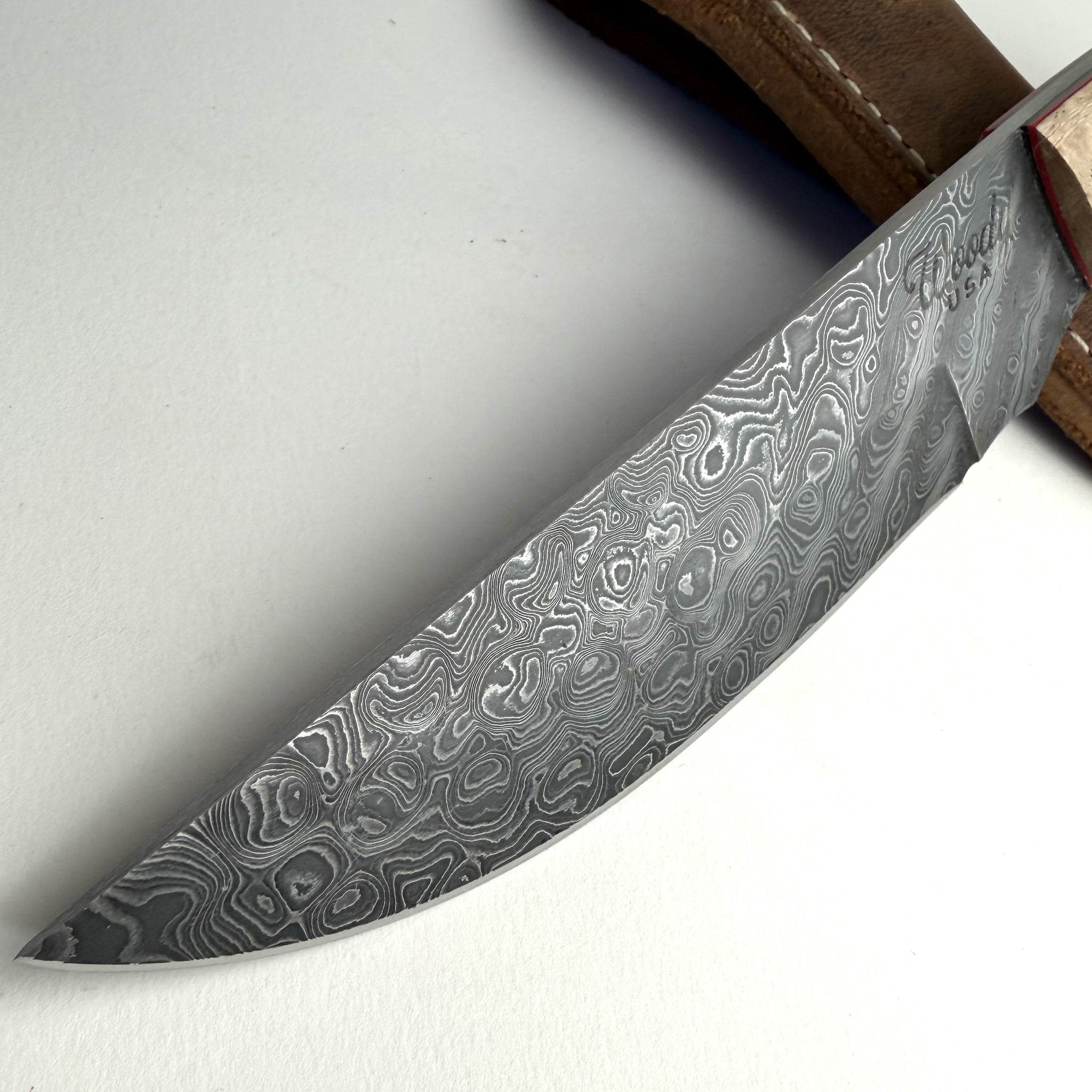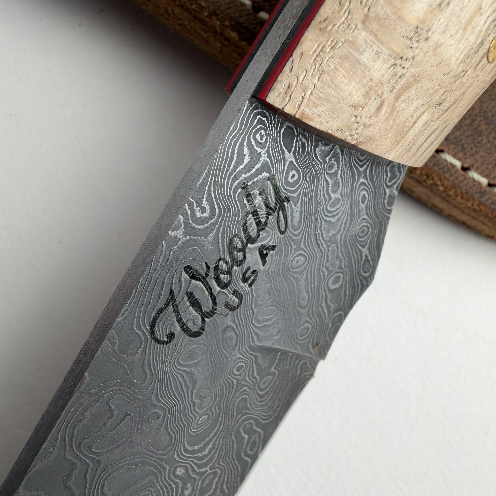 This Woody One and Only is a new design for a small “fighter” style knife designed in the Woody Brand shop by Mr. Gus. This new knife is called the “Birthright” and sports an Alabama Damascus blade with a natural finish white oak handle offsett with both a black and red composite liner. The name “Birthright” comes from Gus’ desire to carry on the family legacy of traditional blade-smithing and he took elements from multiple existing Woody Brand models to create this new design signifying his dedication to the craft. The handles and overall dimensions of this knife are larger and thicker than normal to accentuate the natural beauty of the steel blade and wood handle and to give the blade as much presence as possible. This is blade born from tradition and was made to be an heirloom for generations to come.