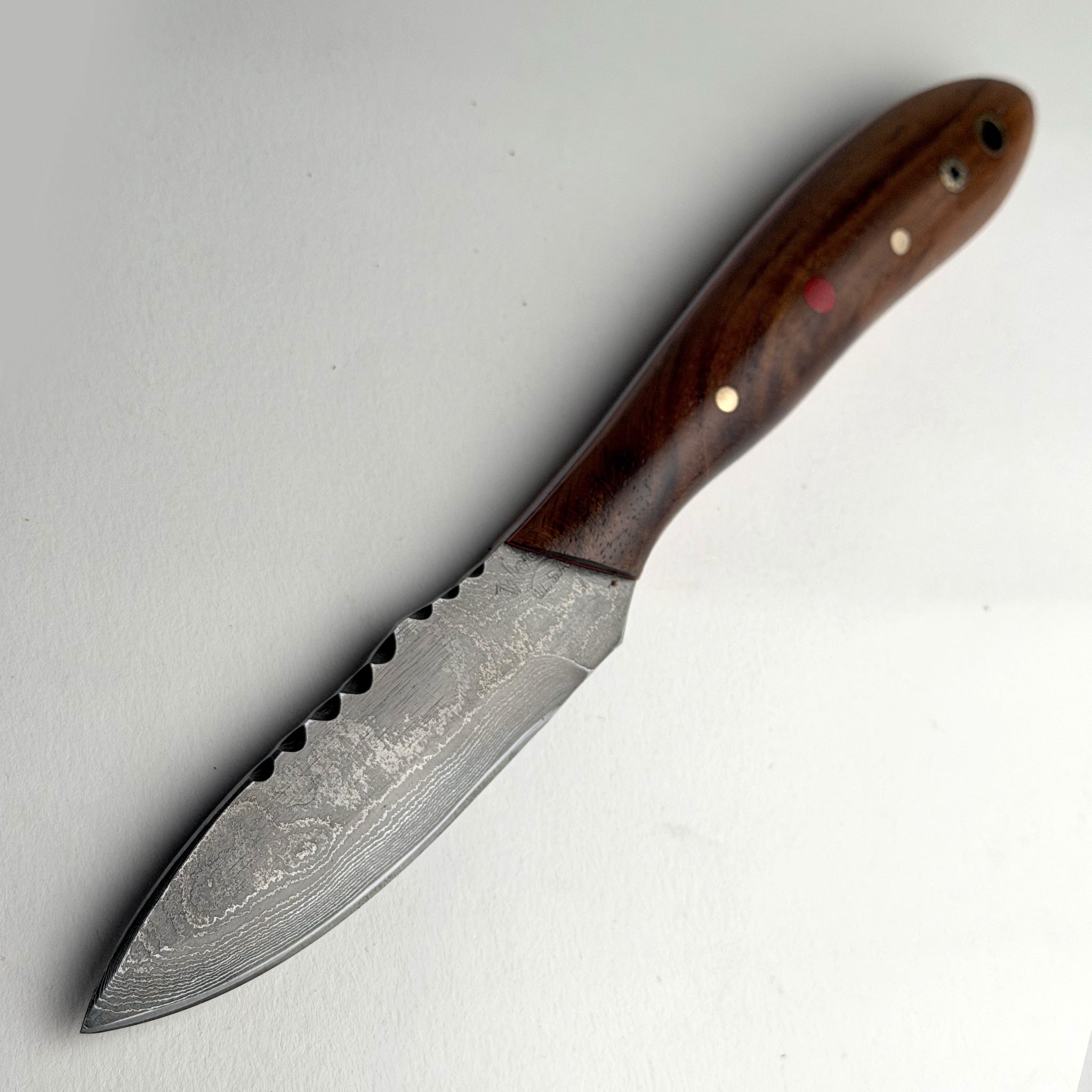 “RED DOT” Special. Woody describes it as his “Drama Queen” version of a famous pattern first introduced long ago by famous Minnesota knife maker Dominick Ingles. Woody’s version takes advantage of some of the most dramatic Texas Mesquite wood ever witnessed by Woody. Woody liked it so well he felt compelled to “Red Dot” it for future reference.