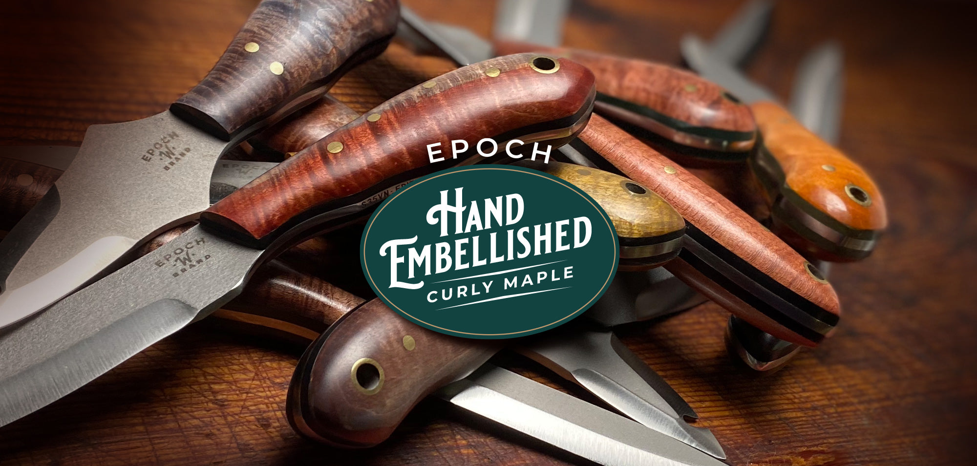 We have a limited supply of these beautiful EPOCH Special Edition Nomads, Maxs and Shuckers. We held back a few of our Second Edition EPOCHS to have a little fun with. After being deliverd ‘Au Naturel, ’ the Curly Maple handle scales on these beauties have been hand-stained to give each indivual knife its own unique coloring. The finishes on these handles are a litte different than the standard EPOCH color choices. Beautiful just got even more beautiful.