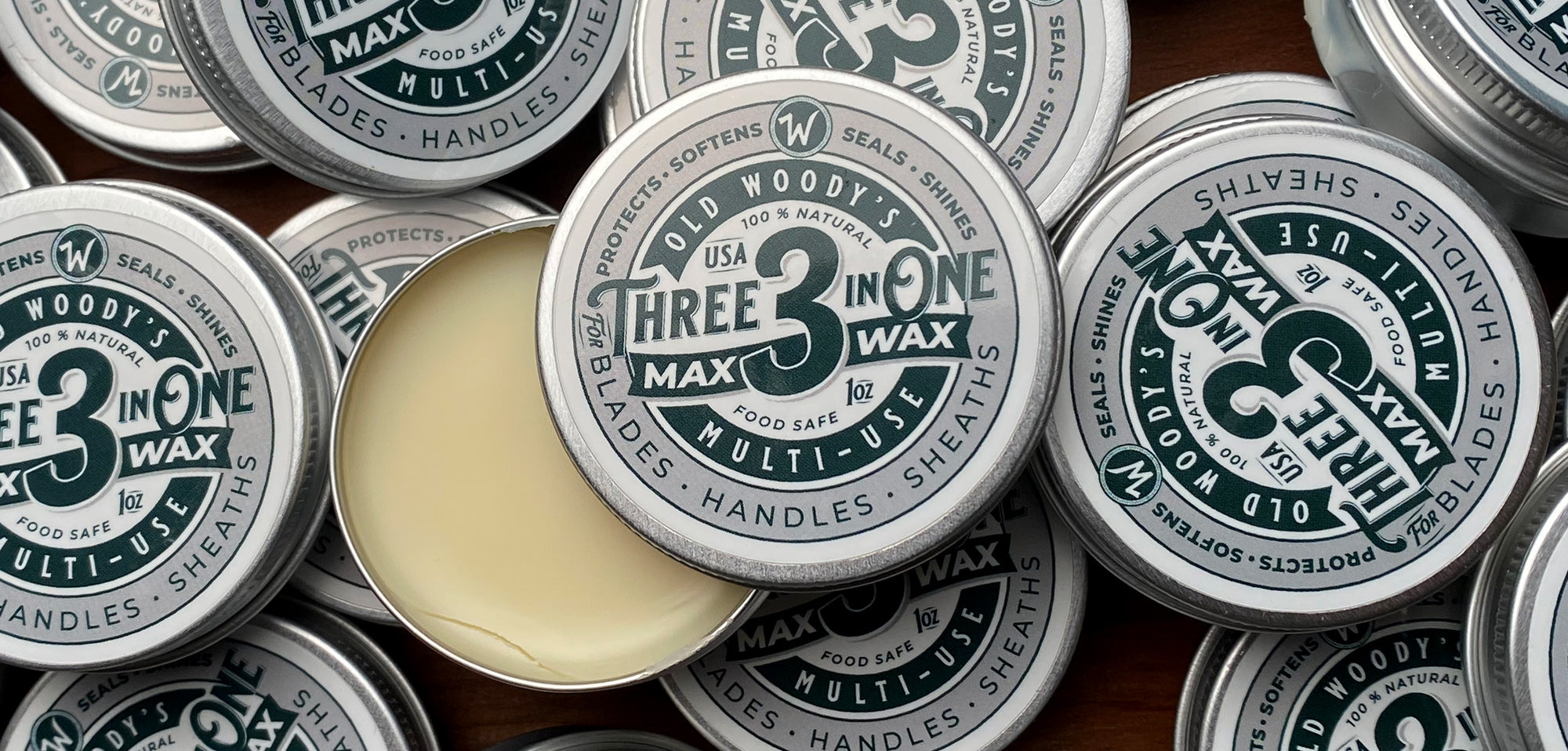 Protect your Woody Brand knives with Woody's own formula of all-natural and food safe ingredients. Old Woody's 3 in 1 MAX WAX is made completely in The Woody Shop. It seals, protects and shines your knife's blade and softens leather sheaths. Sold in a 1 oz. tin - trust us a little bit of Woody's Wax goes a long, long way!