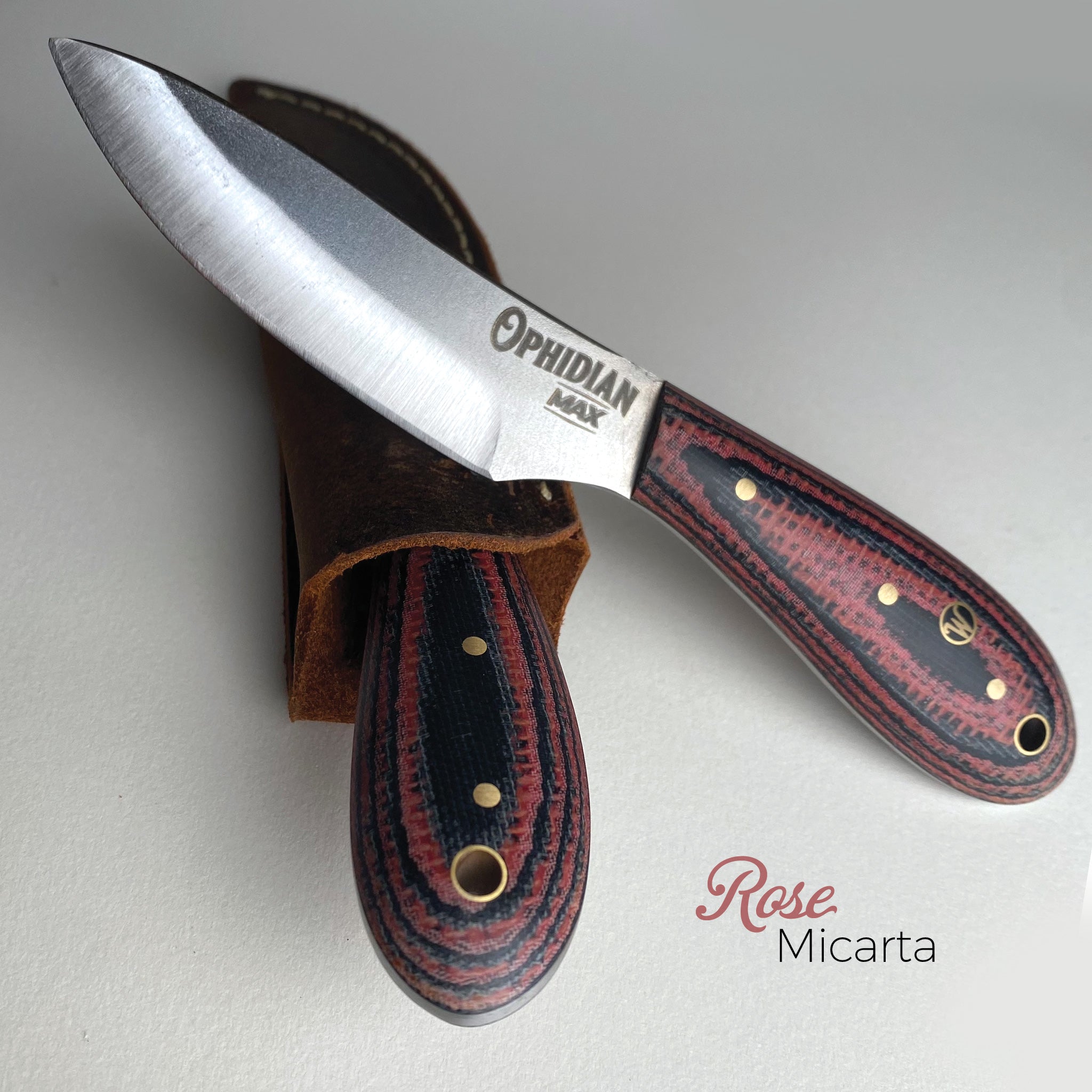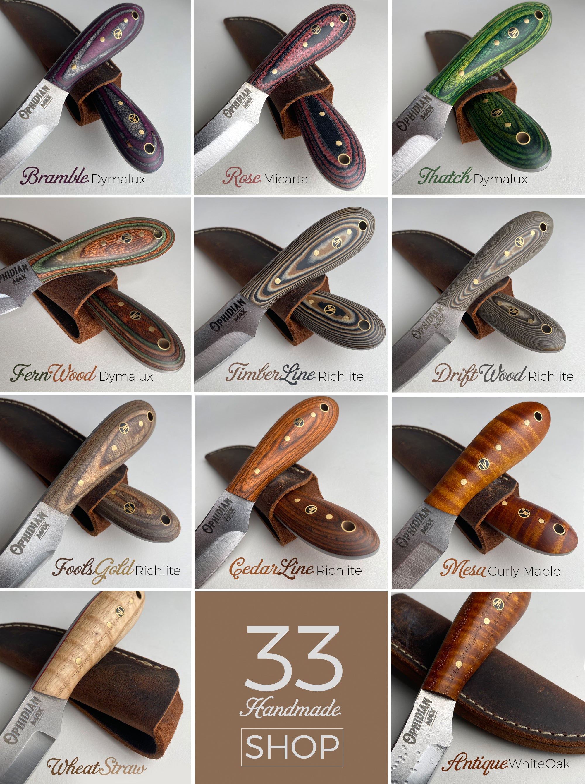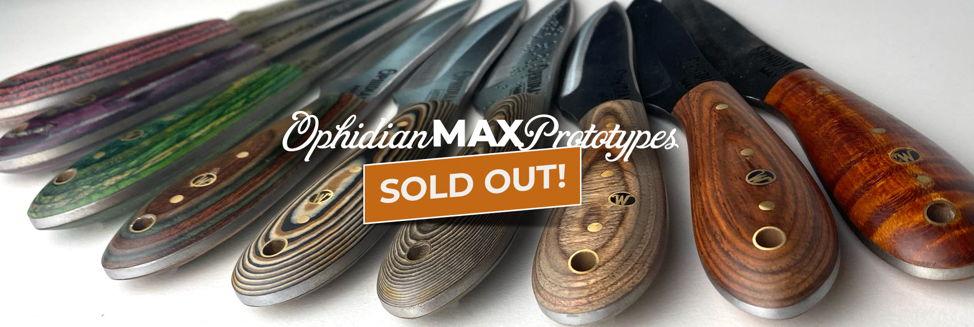 To kick off the next Ophidian Small Batch Series Woody has gotten creative with an Old Standard - The MAX. He and the guys made three prototypes of 11 exquisitely, beautiful handle versions. And they all turned out extra special! So much so, that we are thinking each and every one may be a keeper! But for now we are offering these 33 prototypes - first come first served! Get one before they are gone. Handles are either made of Dymalux, Richlite, Micarta, Curly Maple or White Oak. Blades are 1095 High Carbon Tool Steel with an overall knife length of 7-1/2 inches