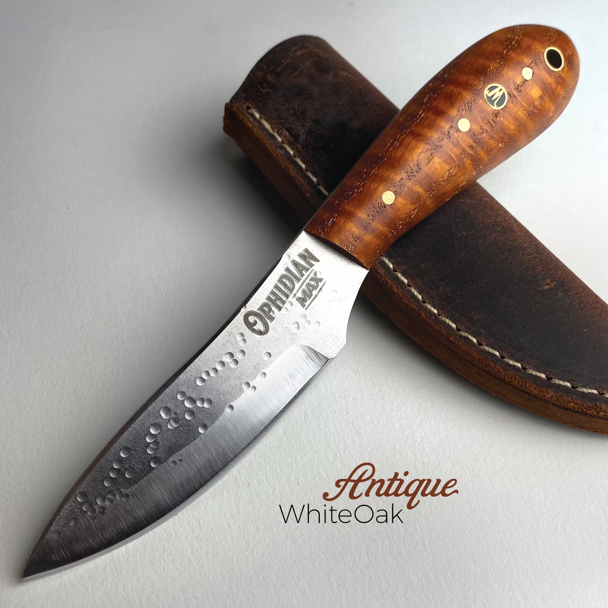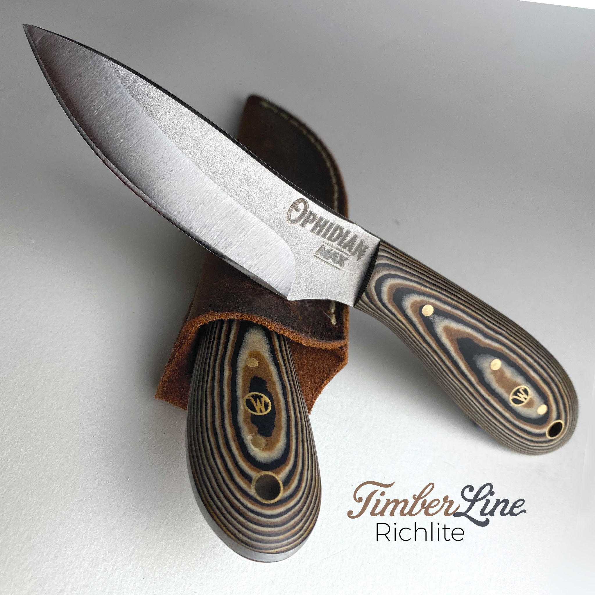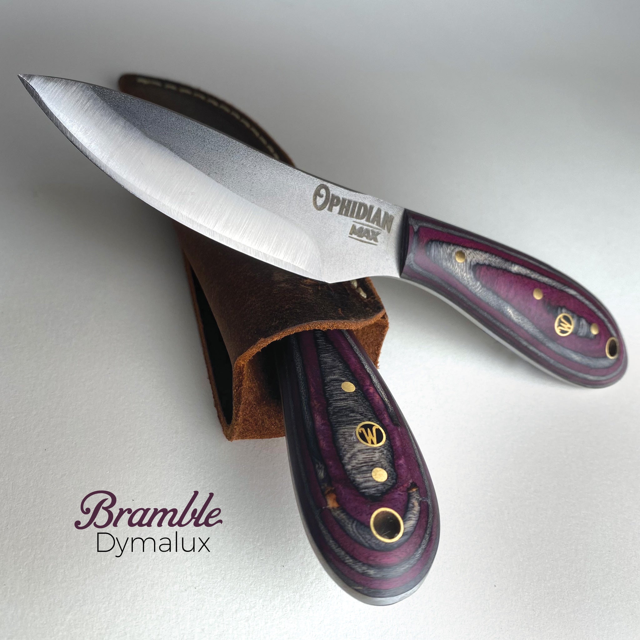 To kick off the next Ophidian Small Batch Series Woody has gotten creative with an Old Standard - The MAX. He and the guys made three prototypes of 11 exquisitely, beautiful handle versions. And they all turned out extra special! So much so, that we are thinking each and every one may be a keeper! But for now we are offering these 33 prototypes - first come first served! Get one before they are gone. Handles are either made of Dymalux, Richlite, Micarta, Curly Maple or White Oak. Blades are 1095 High Carbon Tool Steel with an overall knife length of 7-1/2 inches