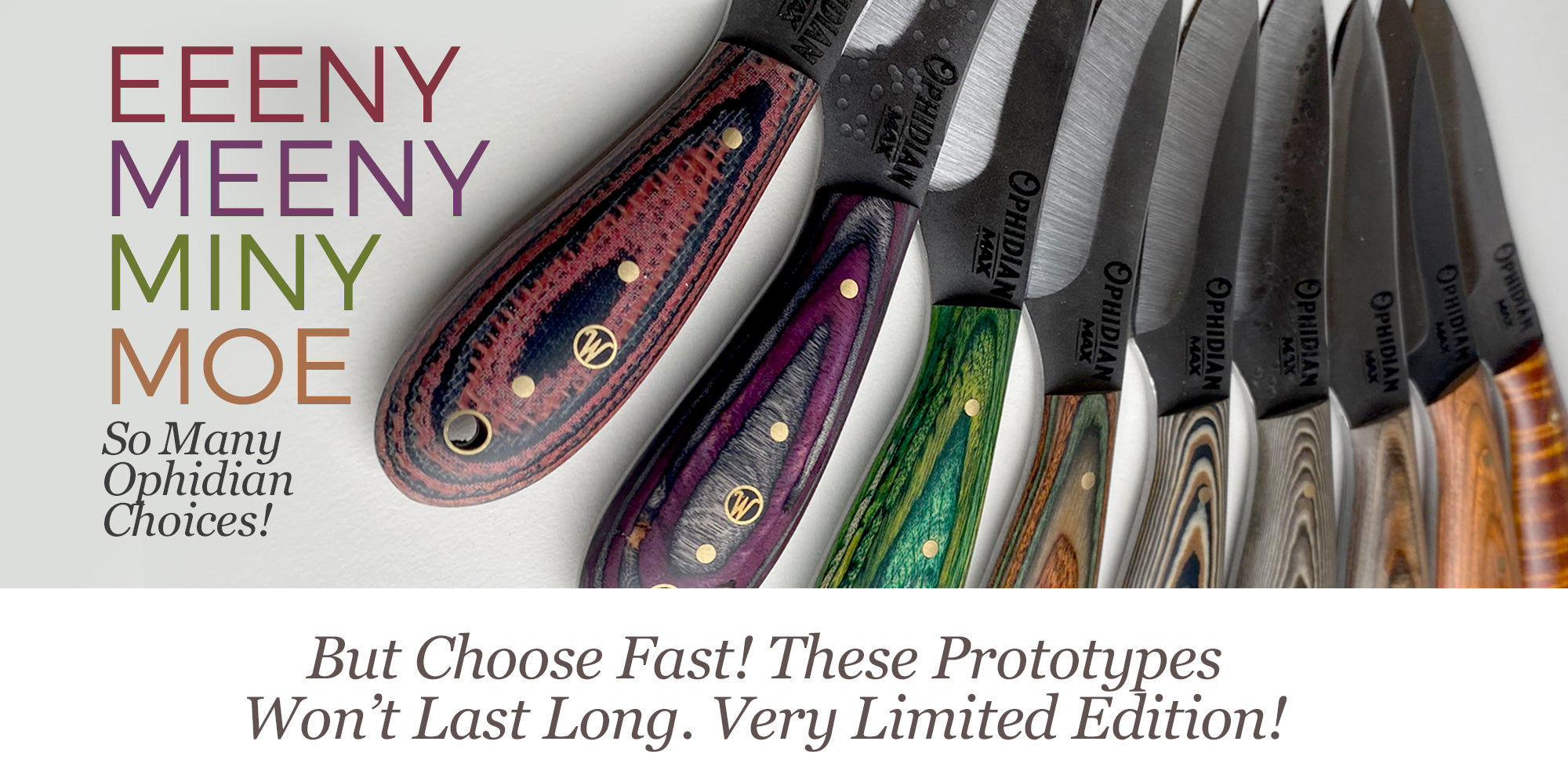 To kick off this next Ophidian Small Batch, Woody and the guys made three prototypes of 11 exquisitely, beautiful handle versions. And they all turned out extra special! So much so, that we are thinking each and every one may be a keeper! But for now we are offering these 33 prototypes - first come first served! Get one before they are gone.