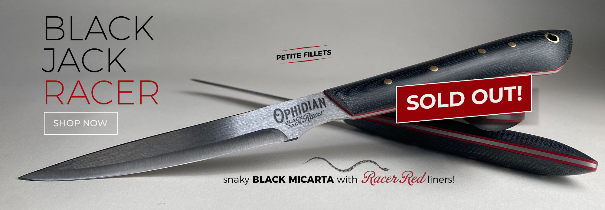 With its snaky-looking handle scales, sleek profile, and precision slicing ability, the Black Jack Racer Fillet is destined to become a tried and true kitchen companion or a trusty friend around the lake and stream. The BlackJack is a lightweight and versatile general purpose Fillet knife. With an overall length of 9.5”, and 4.75 oz weight, it's 5.25” blade of Swedish AEB-L surgical stainless steel is slow to dull and easy to sharpen. The BlackJack Racer will make sleek and speedy work of your filleting needs.