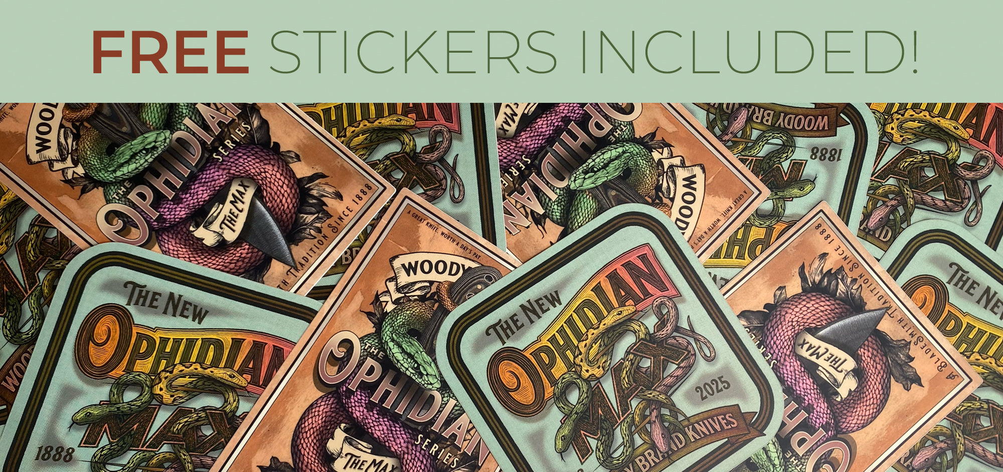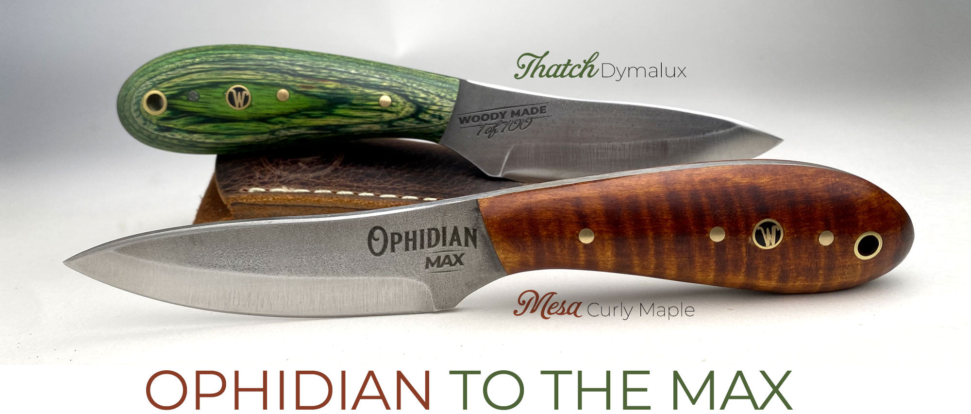 Woody No. 2 is proud to introduce the first two small batches of the new Ophidian Max! The prototypes that we released disappeared like, well, just like a snake in the grass! So, we’ve decided on issuing these handmade MAX Ophidians two handle finishes at a time, in batches of 100 each. When creating these knives, Woody and the boys in the shop explored all the beautiful places our Snaky Ophidian Friends might abide; in the grass, under the fauna, in the thickets and brambles, under rocks, logs and driftwood, down in the canyons, the crooks, crannies and crevices. All those earthy places an Ophidian might call home. So for our first two finishes, you can choose between MESA, a handsome Stabilized Pennsylvania Curly Maple or the striking THATCH Green Dymalux. Can't decide? Go ahead and start your Ophidian MAX collection with both!