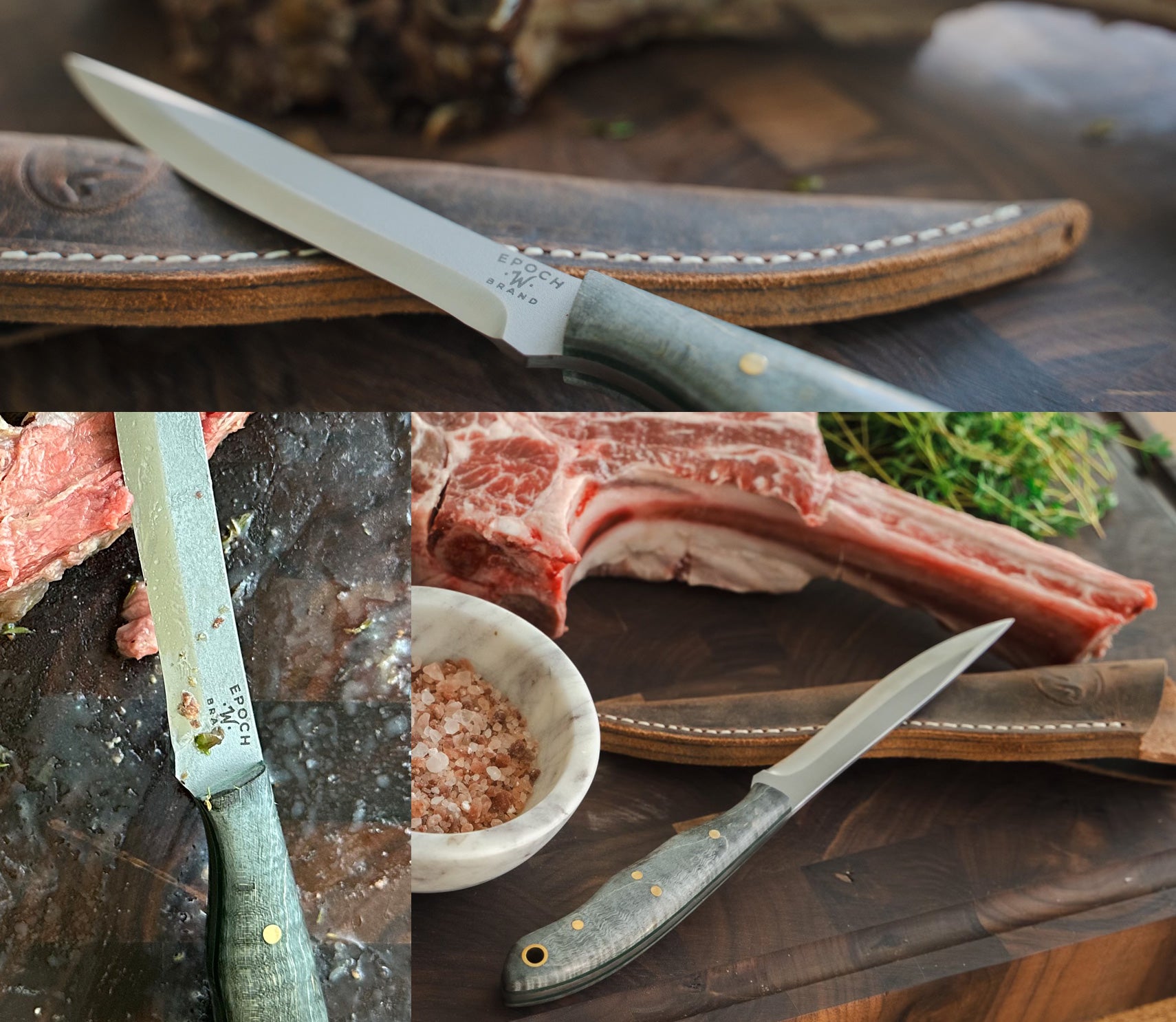 The new, well traveled EPOCH Nomad knows it’s P’s and Q’s around the dinner table. This four-piece steak knife set comes complete with lots of polished manners and excellent social graces, all properly packed in a handsome custom pocket sheath of Top Grain leather made right down the road in Salem, South Carolina by our friends at Hyatt Leatherworks. Your filet deserves the best.
