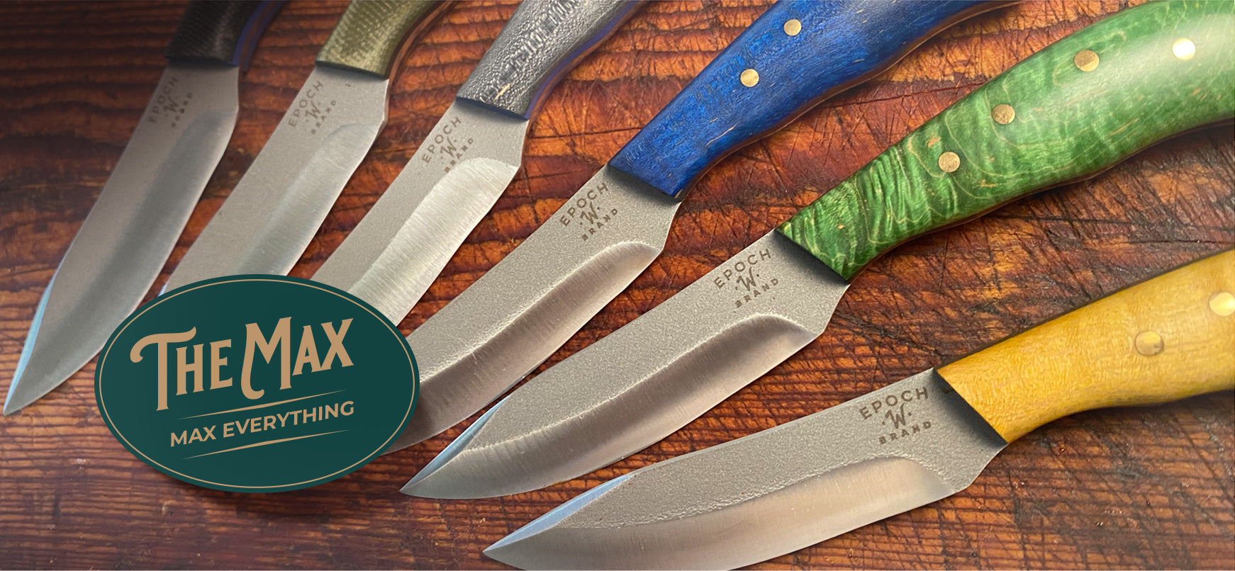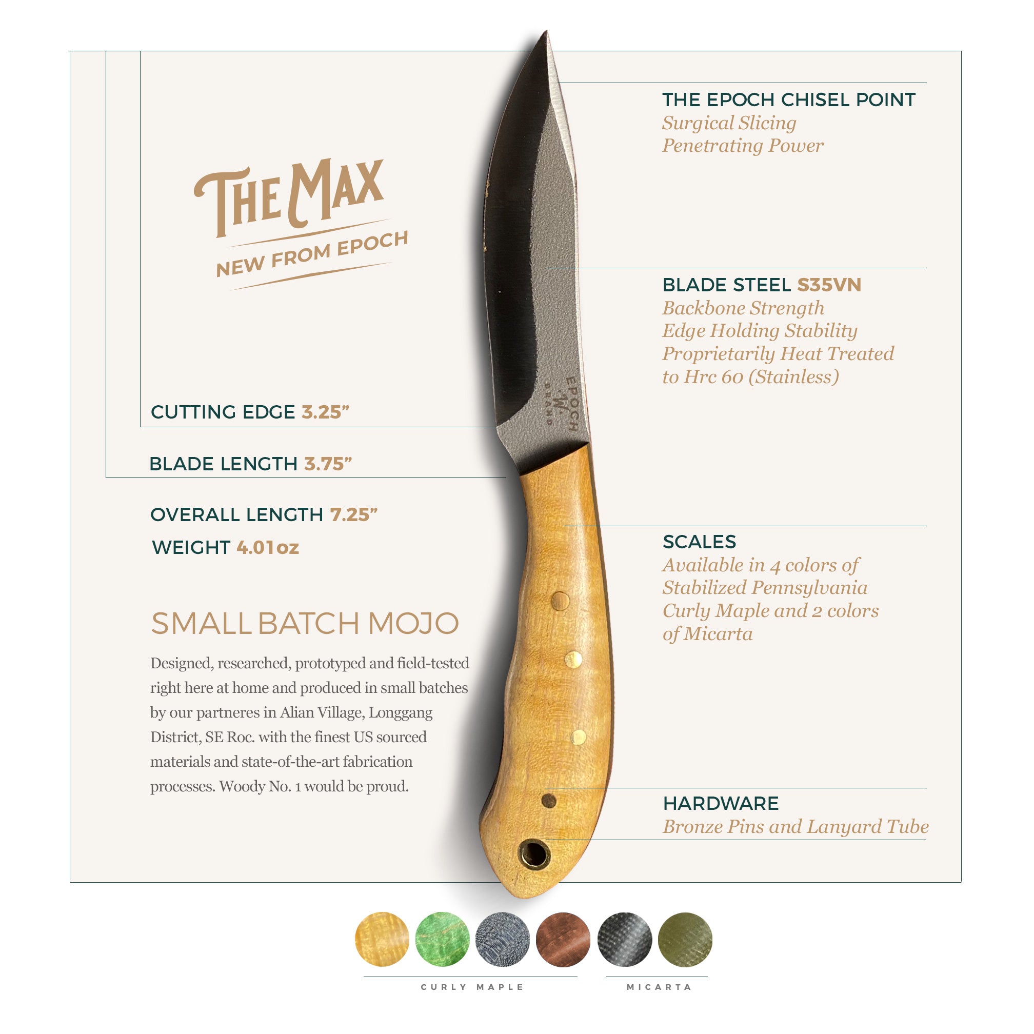 The MAX features our new EPOCH Chisel Point and a blade of SV35VN steel, offering precision penetration, backbone strength and surgical slicing. Max versatility. Max balance. Max beauty. Max affordability. Handle available in 4 colors of Stabilized Pennsylvania Curly Maple and 2 colors of Micarta. Decisions. Decisions.